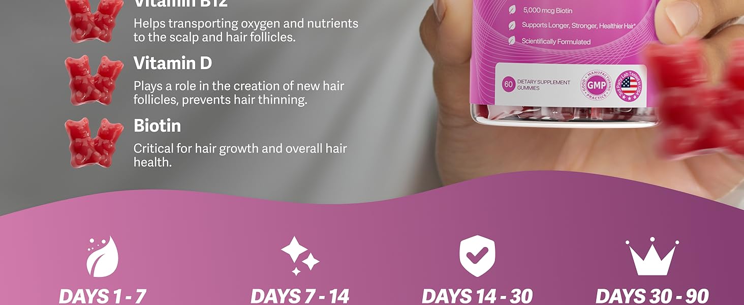 Our Hair Growth Vitamin Gummies are specially formulated to address the nutritional factors that contribute to hair thinning and fallout. The powerful combination of 5,000mcg biotin and supporting nutrients helps strengthen hair follicles, reduce shedding, and promote new growth for visibly thicker, healthier hair over time.